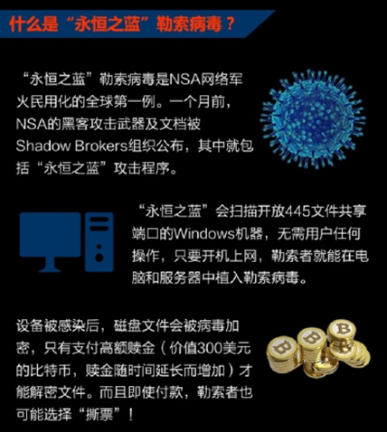 根據(jù)網(wǎng)絡(luò)安全機構(gòu)通報,這是不法分子利用NSA黑客武器庫泄漏的“永恒之藍”發(fā)起的病毒攻擊事件?!坝篮阒{”會掃描開放445文件共享端口的Windows機器,無需用戶任何操作,只要開機上網(wǎng),不法分子就能在電腦和服務(wù)器中植入勒索軟件、遠程控制木馬、虛擬貨幣挖礦機等惡意程序。