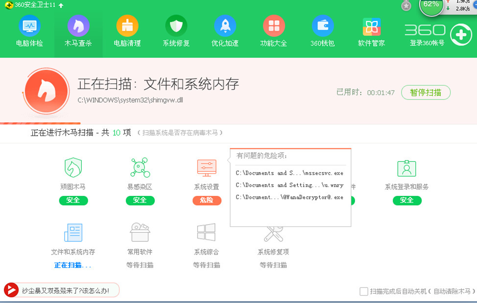 2.使用360木馬查殺功能,清除全部木馬,防止反復(fù)感染。