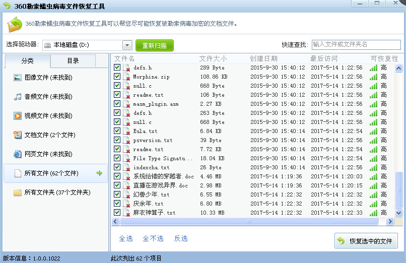 本工具的文件恢復(fù)成功率會(huì)受到文件數(shù)量、時(shí)間、磁盤操作情況等因素影響。一般來說,中毒后越早恢復(fù),成功的幾率越高。