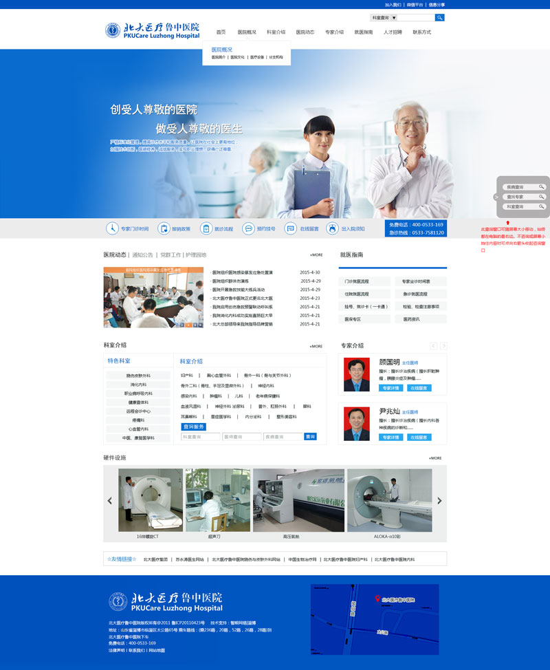 北大醫(yī)療魯中醫(yī)院始建于1966年,歷經40余年,現已發(fā)展成為魯中地區(qū)一所集醫(yī)療、保健、科研、教學、急救于一體的三級綜合醫(yī)院。醫(yī)院占地面積45800平方米,建筑面積44402平方米,實際開放床位686張。醫(yī)院技術力量雄厚,現有職工981人,衛(wèi)生技術人員825人,其中主任醫(yī)師11人,副主任醫(yī)(技)師106人,主治(主管)醫(yī)(技)師248人,研究生導師人數4人。擁有目前國內先進西門子“4D”雙源CT、1.5T磁共振、Philips V3000 DSA、高壓氧艙、膠囊胃鏡、西門子鉬鎢雙靶數字化乳腺機、全自動生化分析儀、美國GE四維彩超、全數字化X攝像系統(tǒng)(DR)等先進設備,先后開展了數字減影全腦血管造影、腦動脈狹窄球囊擴張支架植入術、腫瘤介入治療、肝炎病毒基因監(jiān)測、鞍區(qū)腫瘤切除、髖、膝關節(jié)置換、鼓室成形、胎兒表面超聲三維成像、艾滋病篩查、CT掃描三維成像、介入起搏器植入、心臟搭橋、纖支鏡下肺泡灌洗 、B超及CT引導下進行腫瘤穿刺活檢及射頻消融術、宮頸DNA倍體細胞檢測等技術130余項,擁有淄博市首家廣泛應用于臨床的遠程會診中心,患者在本院即可得到北京301醫(yī)院及上海等多家遠程機構的國家級知名專家的診治,贏得最佳的治療時機。醫(yī)院設有主要業(yè)務科室34個,其中心內科、消化內科、職業(yè)病呼吸內科科、燒傷皮膚科為淄博市特色???。教學科研成果顯著,市級以上科研成果十余項,省部級以上刊物發(fā)表論文500余篇。現為濰坊醫(yī)學院附屬醫(yī)院、濱州醫(yī)學院教學醫(yī)院。