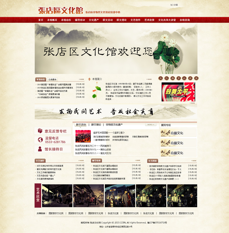 張店區(qū)文化館始建于1950年,是政府設(shè)立的組織、開(kāi)展群眾文化活動(dòng)的公益性事業(yè)單位,館舍總面積為3300平方米。編制17人。按照工作職能分設(shè):辦公室、文藝部、活動(dòng)部、非遺保護(hù)辦公室,擔(dān)負(fù)著全區(qū)群眾文化活動(dòng)的組織輔導(dǎo)培訓(xùn)和非物質(zhì)文化遺產(chǎn)保護(hù)工作。